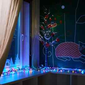 Окно кофейни выходит на удивительный и сказочный город с летающими по небу круассанами, облаками-овечками и живущими возле дерева котами и львом.